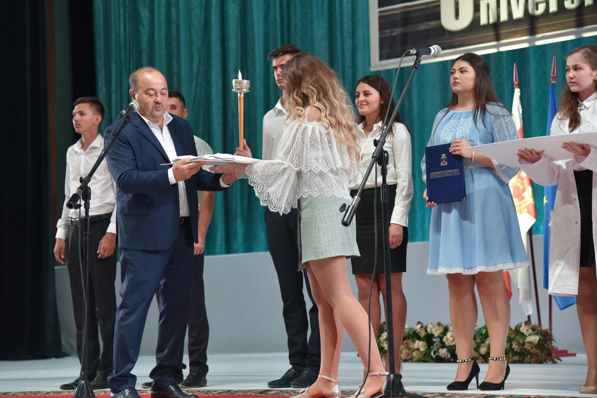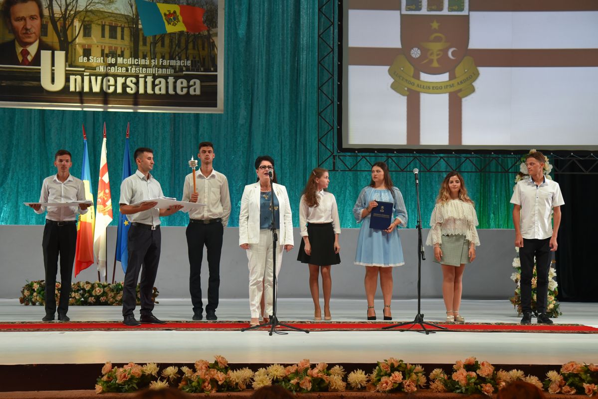Vizibil emoționați, noii mediciniști au rostit solemn Jurământul studentului USMF „Nicolae Testemițanu”, prin care s-au obligat să depună toate eforturile pentru a învăța și a deveni specialiști de valoare, să-și iubească și să-şi respecte profesorii și colegii. Totodată, tinerii au promis că vor respecta Carta universitară și vor urma cu demnitate tradițiile instituției noastre.