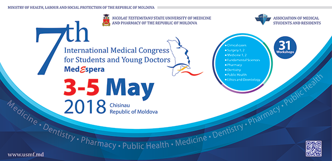 Asociația Studenților și Rezidenților în Medicină în parteneriat cu Departamentul Știință al Universității de Stat de Medicină și Farmacie „Nicolae Testemițanu” din Republica Moldova organizează, în perioada 3-5 mai 2018, cea de-a VII-a ediție a Congresului Internațional pentru Studenți și Tineri Medici MedEspera 2018.