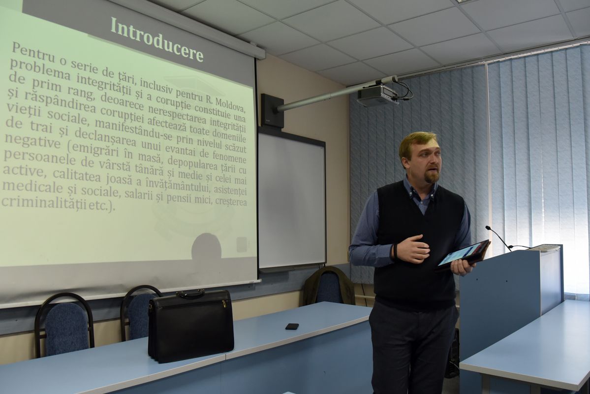 De asemenea, în data de 24 octombrie, la solicitarea administrației Universității, un reprezentant al Centrului Național Anticorupție a ținut o prelegere la tema „Combaterea fenomenului corupției în educație” pentru personalul administrativ, didactic, ştiinţifico-didactic şi auxiliar al instituției. Acesta a venit cu un mesaj de sensibilizare și informare privind prevenirea factorilor de corupție în mediul public, dar și în cel academic. „Astăzi, în spiritul integrităţii şi intoleranţei faţă de fenomenul corupţiei, venim cu recomandări atât la nivel de instituție, cât şi la general, privind conduita și instituirea unor instrumente anticorupție în instituție. Standardul de integritate în învățământul superior este valabil pentru toate instituțiile de acest rang, iar scopul Centrului Național Anticorupție este de a ne uni eforturile comune pentru a lupta împotriva mecanismelor de combatere a acestui flagel”.