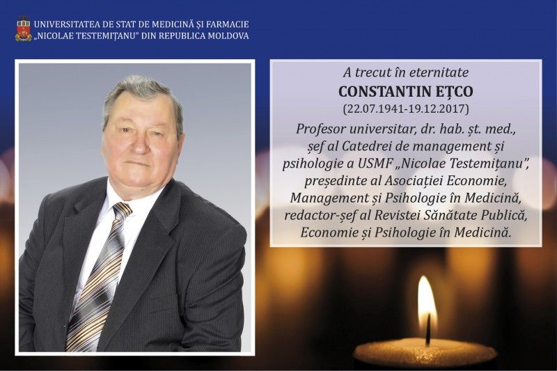 Comunitatea academică a Universității de Stat de Medicină și Farmacie „Nicolae Testemițanu” este profund îndurerată de trecerea în eternitate a profesorului universitar Constantin Ețco, dr. hab. șt. med., șef al Catedrei de management și psihologie, președinte al Asociației Economie, Management și Psihologie în Medicină, redactor-șef al Revistei Sănătate Publică, Economie și Psihologie în Medicină.